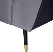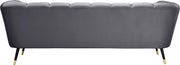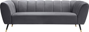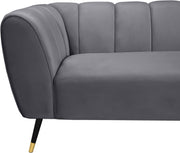 Sink your body into the inviting comfort of this Beaumont velvet sofa. Upholstered in a soft shade of grey with black metal legs tipped in gold, this chair oozes modern charm and up-to-the-minute comfort. The heavily stuffed arms, seat and back are bound to beckon at day���s end for you to sit and relax. Deep channel tufting on the back and arms adds to its uber welcoming look. Pair it with the matching pieces in the same collection for cohesive beauty.
