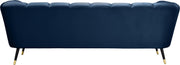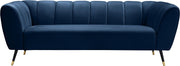 Sink your body into the inviting comfort of this Beaumont velvet sofa. Upholstered in a soft shade of navy with black metal legs tipped in gold, this chair oozes modern charm and up-to-the-minute comfort. The heavily stuffed arms, seat and back are bound to beckon at day���s end for you to sit and relax. Deep channel tufting on the back and arms adds to its uber welcoming look. Pair it with the matching pieces in the same collection for cohesive beauty.