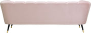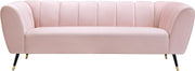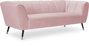 Sink your body into the inviting comfort of this Beaumont velvet sofa. Upholstered in a soft shade of pink with black metal legs tipped in gold, this chair oozes modern charm and up-to-the-minute comfort. The heavily stuffed arms, seat and back are bound to beckon at day���s end for you to sit and relax. Deep channel tufting on the back and arms adds to its uber welcoming look. Pair it with the matching pieces in the same collection for cohesive beauty.