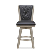The Berkely Counter Stool adds a bit of modern glam to your kitchen or entertainment space with its flared, button tufted back and platinum finish. The 24" seat is capped with a cushion crowned in a black PU, fully welted for an upscale look. The stool has a 360-degree swivel, making it easy to converse and enjoy the party. Crafted of solid wood for strength and durability. Also available in 30" bar height.