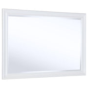 Textured rattan drawer fronts create a fresh, modern coastal aesthetic for this contemporary bedroom set. Offering ample storage and a clean look and feel, the set centers on a wooden bed with a gently flared, upholstered headboard with plush foam padding for easy comfort. The set includes a bright white finish, offering easy contrast to the rattan and linen-colored fabric upholstery that creates cool ambiance. Top drawers in the set include black felt lining and drawers are dotted with round metal knobs. The dresser includes a framed mirror while the nightstand offers both a drawer and a shelf for easy storage and decor.