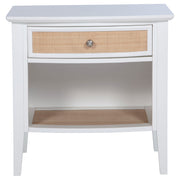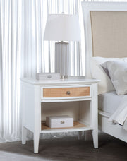 Update your bedside with the approachable, tailored style of this modern coastal nightstand. Complete with one drawer and one shelf, it provides an easy mix of storage and display, creating a place for all your evening essentials. The nightstand boasts a fresh white finish paired with natural rattan accents on the drawer front and shelf. The drawer is complete with felt lining, in stylish black, offering the perfect touch of luxury and protection for delicate items. Add a few favorite books to the shelf to create a personal touch at your bedside.