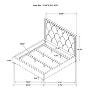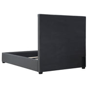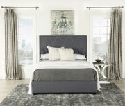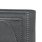 Treat a master or bedroom suite to the ultimate in Art Deco flavor with a plush, enticing panel bed. Designed to infuse romance and artistry, this decadent bed is wrapped in charcoal linen-like fabric. Its construction features a mix of hardwoods and wood products. An extra tall headboard presents a showcase vibe with a scalloped pattern created using individually hand-driven nail heads as an outline. Matching padded side rails and footboard complete the exquisite ambiance of a must-have anchor piece for a glam boudoir.