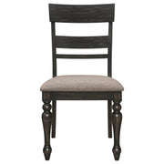 Traditional attitude is bold and rustic with modern updates adding style to your dining area. This five-piece dining set brings out the best in a hybrid aesthetic of farmhouse and mid-century looks with a soft, versatile color and finish palette and construction of Asian hardwoods and wood products. A rectangular table mixes finishes between its brown brushed finish top and a glam charcoal sand through finish base and legs. Curvy lines and turned legs add an alluring feel to a table playing host to brown finish ladderback chairs. A smoothly arched side silhouette with turned front legs creates a glam look, embellished with neutral and soft stone brown fabric seat upholstery.