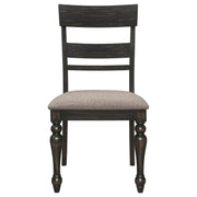 This set of two dining side chairs defines the classic traditional aesthetic with an extra dose of bold, opening up multiple options for assembling a dining space you’ll come to love. Asian hardwood and wood products construction is sturdy and stable, reflecting the best of old-style quality. With a dramatic charcoal sand through finish and notable farmhouse-inspired details that include a flared back silhouette, a ladderback design, and turned front legs. A lightly curved side silhouette offers tapered back legs. Dine or relax with comfort in padded chairs featuring textured light stone brown fabric upholstery.