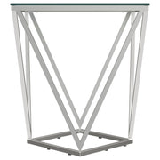 Simple geometric shapes combine to form a strikingly modern end table. The design features open, flared triangles in metal with a gleaming nickel finish, creating a dynamic base. A square glass top offers a smooth, airy surface, perfect for displaying decor or serving cocktails. The square base, rotated to form a diamond, adds an unexpected artistic touch. Perfect for a foyer or as a chic accent in a contemporary seating area, this table enhances any space with elegance and modern style.