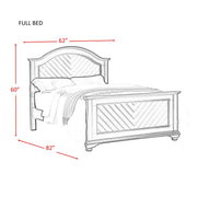 The Brookpine White Full Panel Bed gives your room the look and feel of cottage charm, featuring chevron patterned veneers in a casual white finish. The headboards arch shape, astragal moldings throughout, and bun feet give this panel bed unparalleled style and individuality. - Panel Bed - Chevron Pattern Veneers Throughout - Bun Feet - Bevel Edges - Casual White Finish - Traditional Design - Includes: Headboard, Footboard & Side Rails - Mattress & Box Spring are Required Poplar Wood MDF Butt Joint Construction Corner Blocked Reinforcements 4 Slat Supports 4 Slats 82 D x 62 W x 60 H, 117lbs. 1 Year Limited Manufacturer Warranty