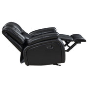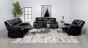 Bold black leatherette upholstery offers the look of luxurious leather with easy-care maintenance as the three-piece motion sofa set is versatile and beautiful. Living rooms, family rooms, and media venues become comfort zones with the plump feel and clean design of a classic sofa, loveseat, and recliner glider set built for hours of seating comfort as well as entertaining. Manual reclining is easy and pleasant, allowing a variety of positions for sitting and lounging, as the recliner chair adds smooth gliding movement. Choose this elegant sofa set with pillowy support, as attached seat and back cushions feature plump foam filling with channeling to target body comfort and padded armrests over rounded sides. Entertain in style and sheer comfort with a motion sofa set that’s ideal for lounging and napping.