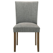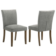 Upgrade your dining table with the fresh silhouettes and contemporary flair of this set of two modern side chairs. Each boasts an armless profile and lovely upholstery that creates the perfect touch of texture. Foam cushions provide exemplary comfort, perfect for everything from weeknight meals with the family to entertaining. Brown finish wood legs provide stability and create a hint of contrast against the upholstery. Choose this set for a new or existing dining table to bring a breath of fresh air.