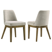Complete your dining ensemble with this set of two modern side chairs. Offering inviting ambiance to your kitchen or dining room, the pair features a neutral look with a brown oak wood grain finish. Light tan fabric upholstery adds a touch of contrast and airy ambiance. Foam cushions complement with excellent comfort, offering welcoming flair to a comfortable and inviting silhouette. Each chair features a wooden base design with tapering legs for a strong presentation at your dining table.