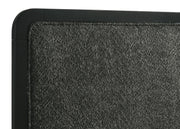Tailored drama abounds in this modern bed with an upholstered headboard. Its crisp black finish pairs perfectly with charcoal fabric to create a deep, bold focal point for your bedroom. The bed boasts a tall headboard and low footboard, offering airy, open personality. Rounded corners complete the look, providing a softened effect for its overall silhouette. The bed is complete with levelers on its legs, allows for compensation for uneven flooring to ensure stability.