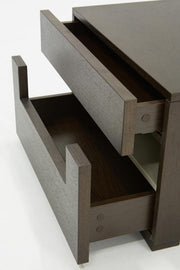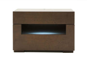 An LED light in the top cubby provides not only accent lighting but functional lighting for early morning or night time use. Two drawers administer abundant storage for your reading glasses and favorite book. Finished in a white gloss for a clean and contemporary design. Matching set pieces available separately. Available in a brown oak wood veneer finish.