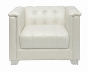 Make the most of a mixed motif. A casual space comes to life with the glamorous ambiance of this side chair. Enjoy a classic tuxedo silhouette with a low profile. Deep button tufting over quilted pearl white upholstery stylizes and refreshes any room aesthetic. Heavy duty chrome doorknocker handles and chrome legs add finishing touches that up the ante on charm.