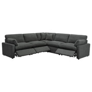 Transform your living space with the versatile 5-piece modular sectional, designed to offer a perfect blend of comfort, style, and customization. This sectional features three power reclining pieces and two non-reclining pieces, allowing you to create your ideal seating environment. With the option to add additional power or non-power armless chairs, you can customize the layout to suit your room and preferences. Enjoy the plush comfort of premium down-like filled cushions and a sleek, modern design that enhances any decor. Experience the ultimate in relaxation with the power reclining pieces, featuring a 4-inch wall-hugging design for full recline without needing excessive space.