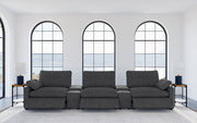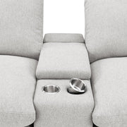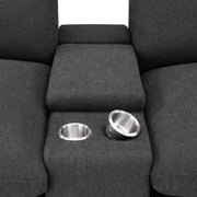 This three-seat home theater seating set combines modern convenience with plush comfort. Each power recliner offers smooth adjustability, while two center consoles feature lift-top storage and dual stainless steel cup holders. Upholstered in soft fabric, the generously padded cushions and pillow-top armrests enhance relaxation. Built for durability and long-lasting support, this seating arrangement is perfect for creating a cozy entertainment space.