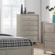 Crown Mark Lyssa 5 Drawer Chest in Embossed Crocodile Pattern B4300-4. This glamorous bedroom collection features an embossed crocodile finish, decorative knob hardware, and contemporary clean lines. The centerpiece of the collection, the stunning bed, has a diamond tufted headboard surrounded by LED back lighting. Storage pieces have durable dovetail drawers with metal glides.