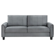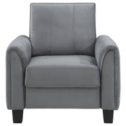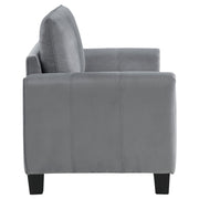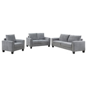 A perfect blend of comfort and sophistication, this three-piece modern sofa set is a chic centerpiece for your living room. It boasts a sofa, loveseat and armchair, each with velvety soft gray upholstery that creates a sleek but inviting ambiance. Back cushions feature vertical accent stitching and are reversible for added versatility. Rounded arms and block feet deliver a structured silhouette, creating a sense of gravitas in any sitting aera. Cushions are supported with sinuous spring decking and webbed backing, ensuring optimal support for everything from lounging to entertaining.