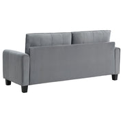 Captivating character blends with timeless style in a modern upholstered sofa. In gray upholstery that's soft like velvet, the sofa is a lovely focal point for a living room seating group, offering refined, understated style and plenty of comfort. Rounded armrests feature gentle pleating for a smooth, sleek look and feel. Stitching accents and block feet complete the look, offers depth and structure. Back cushions are reversible, great for busy homes.