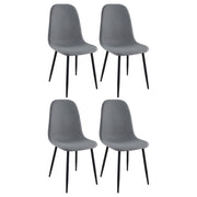 Create an inviting ambiance with a set of four contemporary side chairs. Perfect for a kitchen or dining room table, the chairs boast a light, airy silhouette with stylish, updated appeal. Each includes neutral gray upholstery and a bucket seat that delivers inviting comfort and support. Chairs stand on splayed legs crafted from metal tube with a black finish that blends into surrounding decor. Legs are complete with plastic glides that add protection for delicate flooring.
