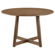 Small kitchens and dining spaces take an early style lead with a casual dining set targeted at versatility and mid-century modern creds. This beautifully designed five-piece set offers construction of walnut finish Asian hardwoods, warm and inspiring of a coastal or Euro look. A convex tabletop profile embellishes the already fresh style of a geometric base with angled open sections interlocking at the base, forming a symmetrical and quirky design with extra verve. Four chairs are charming with a curved, slender back and accents, tapered legs and foot rails. Padded seat cushions with moderate molding are upholstered with neutral brown fabric.