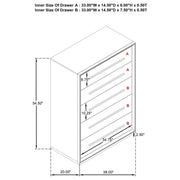 Invest in the inviting style and striking architectural allure of this five-piece modern bedroom set that centers on an upholstered bed. Perfect for relaxation in a soothing bedroom ensemble, the set delivers ample storage with a eight-drawer dresser and mirror, a five-drawer chest, and a two-drawer nightstand. Cool cream upholstery with grid style tufting decorates the bed, while a Taupe oak wood finish is invitingly neutral to complement the linens of your choice. The extra-tall headboard creates a structured profile for the set, which is adorned with long bar pulls on its drawer fronts. Use wide tops for decor that brings personality and character to your welcoming, refined bedroom.