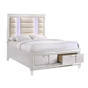 Elements International Twenty Nine Queen Platform Storage Bed in White TN700QB. This super chic bed not only looks good, but its super practical. The footboard comes equipped with two spacious drawers, perfect for storing away extra linens. The headboard has an LED mood light, making it ideal when you need a little bit of extra light. The headboard features channel tufting, adding extra flair to this glamorous piece. Just like the case pieces, the mirror glass trim frames the bed giving this bed its chicness. Clear, acrylic drawer pulls and feet complete the look of the platform storage bed that will be a staple in your home for years to come.
