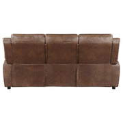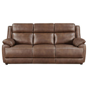A chic mottled effect brings authenticity to the lush faux leather upholstery of a transitional sofa. Seating three, it features a dark brown color that's deep and rich, a perfect complement in a stylish but relaxed living room. The sofa boasts exceptional comfort and support, complete with pocket coil seating and full foam cushions. Pillowtop arms complement plush cushions, creating the perfect spot for lounging. Its relaxed stance makes this sofa the perfect choice for a family room or den, creating a welcoming aura that brims with comfort.