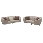 The gentle curvature of a kidney silhouette brings graceful energy to this two-piece modern sofa set. A smooth bench seat is complemented with a channel tufted back in both the sofa and loveseat, creating stylish ambiance and comfortable seating. Soft beige upholstery fabric sets the tone, while accent pillows add flexible comfort and inviting ambiance. The set shows off a tailored profile, complete with a shelter back and sloping arms. Each piece stands on slender, tapered legs in a black finish, offering a touch of contrast and depth in your living room.