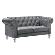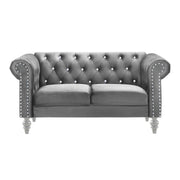 Introducing the Emma living room set - the perfect combination of style and comfort for your home. This set includes a sofa, loveseat, and chair, all featuring a stunning crystal tufted back that adds a touch of glamour to any space. Made with 100% polyester, these pieces are durable and easy to maintain. The set is available in three sleek colors - blue, black, and gray - so you can choose the one that best matches your decor. Upgrade your living room with the luxurious Emma set and enjoy hours of relaxation and entertainment.