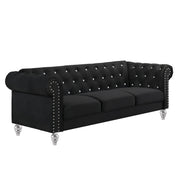 Introducing the Emma living room set - the perfect combination of style and comfort for your home. This set includes a sofa, loveseat, and chair, all featuring a stunning crystal tufted back that adds a touch of glamour to any space. Made with 100% polyester, these pieces are durable and easy to maintain. The set is available in three sleek colors - blue, black, and gray - so you can choose the one that best matches your decor. Upgrade your living room with the luxurious Emma set and enjoy hours of relaxation and entertainment.