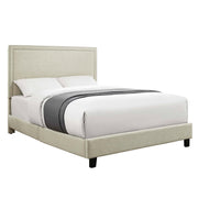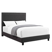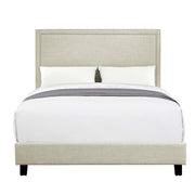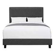 The Erica Upholstered Queen Platform Bed will instantly give your bedroom the update youve been craving! This stylish upholstered bed features chrome nail head trim along the headboard. No box spring required here, thanks to the euro slats! The euro slats offer a flexible foundation for your mattress. Keep it classic or mix it up, by pairing the Erica Bed with the Erica Chair for a complete look! - Upholstered Platform Bed - Euro Slats - Chrome Silver Nail Head Trim - Part of Emery Collection - Ships in One Box - Mattress Only Required - Straight Leg Feet Wood Frame: Eucalyptus/Plywood; Feet: Poplar Solid Wood; Cushion Filling: Foam 86 D x 64 W x 53 H, 89lbs. 1 Year Limited Manufacturer Warranty