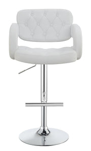 A rec room or home bar never had such chic bar seating. Chrome finish leg and base with shimmering white upholstery. Cushioned seat adjusts to maximize your presence, with chrome footrest to help maintain your perspective. Padded armrest allows you to lean comfortably in to make your point or sit back and nurse a martini. Trendy yet practical, bar stool is a modern enhancement to your home entertainment.