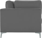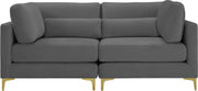 Ready to get cozy? Curl up from the welcoming confines of this Julia velvet modular sofa and you can do just that! Its soft grey velvet upholstery is soft and supple to the skin, coaxing you to relax, unwind, and sit for a spell. It comes with both gold and chrome legs for a customizable and contemporary finish. Pair this Julia piece with others to form an infinite number of seating configurations to meet your particular decorative desires and space requirements.
