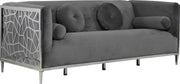 Catch the eyes of all who step foot in your home with this bold Opal grey velvet sofa. Its chrome stainless steel patterned design creates a contemporary flair against its plush, grey velvet upholstery, creating a home accent piece that is both comfy and stylish. Its roomy design offers ample room to kick back and relax after a long day, while its stocky shape adds a daring touch to your decor.