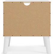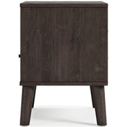 The perfect marriage of contemporary and casual style, this nightstand is a charming addition to your home. It features an expressive two-toned look, with a dark charcoal finish over replicated oak grain with an authentic touch and a replicated sugarberry wood grain. Matte black knobs and splay legs add a finishing touch, while the open shelving allows for extra storage.