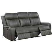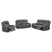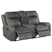 Merging the classic style of both contemporary and transitional design schemes, the three-piece sofa, loveseat, and recliner set create a dreamy venue for relaxing. The trending look of smooth grey leatherette upholstery with vertical topstitching delivers decorative elements and a dimensional impact. This motion-reclining set features foam padding on its frames and pocket coil spring seat cushions, as attached back cushions are capped with ultra-plump headrests. Recline into varying positions using a manual control function, and enjoy space efficiency with its wall-hugger design. Bonus features include a center-mounted loveseat console with a flip-top storage bin and a pair of handy beverage holders.