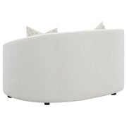 Create your modern entertaining area with this mid-century modern-inspired contemporary seating set, upholstered in a neutral latte finished boucle fabric across its elegant and curvy silhouette. Curved and sloped armrests and plush cushions keep family and visitors comfortable all through the gathering. Coordinating boucle accent pillows with premium faux down fill provide extra comfort as discreet black legs offer a bit of elevation and definition over decorative rugs.