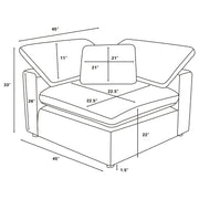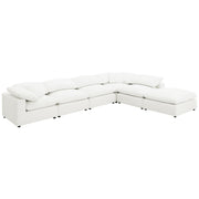 Center your relaxed living space on a modern six-piece sectional sofa, taking a laid-back approach to seating. This sofa, upholstered in tailored water-resistant boucle performance fabric with topstitch details, offers a refined, contemporary style in a neutral hue, perfect for any inviting living room. Customize your seating space with modular options, allowing you to create the perfect lounging environment. The plush, feather blend filled cushions will leave you motionless in ultimate comfort, as if wrapped in airy, cloud-like seating. Wide track arms add structure to the low slung silhouette, while an included ottoman encourages relaxation and round legs provide excellent support, complete with plastic glides to protect your flooring.