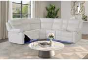 The U6026 Sectional by Global Furniture USA is the epitome of comfort and convenience. This luxurious sectional features manual recline on the two end positions, allowing you to relax in style. The addition of a console with storage and cupholders enhances the functionality of this piece, making it perfect for movie nights or cozy evenings at home. Finished in a blanche white, this sectional combines elegance with practicality, creating a sophisticated focal point for your living space.